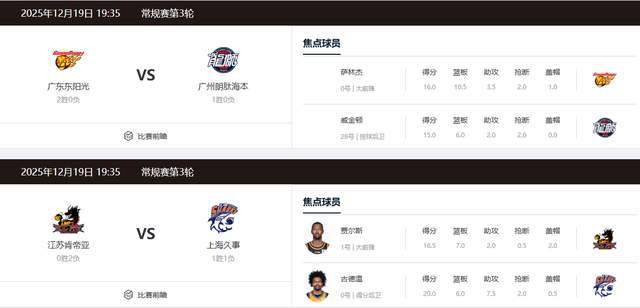 12月19日晚上只有2场,本赛季的第一场广东德比大战——广东男篮坐镇主场迎战广州男篮,看看郭艾伦能不能率队爆冷吧。另外一场是上海男篮客场挑战江苏,卢伟不至于再输吧。