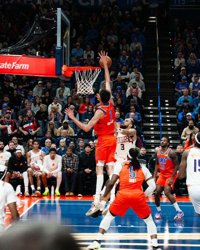 太阳队的布克继续缺席。雷霆队在主场先发制人,华莱士连拿5分,亚历山大贡献4分,他们以11-2领先。布鲁克斯和阿伦轮流得分阻止差距拉大,霍姆格伦还击5分,雷霆队牢牢保持领先。两队拉锯几个回合,太阳队命中率再次下降,米切尔、华莱士和卡鲁索合取10分,首节还有2分10秒时雷霆队以36-16领先20分。古德温三分回应,太阳队以7-2的反击波结束首节,他们以23-38落后。