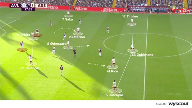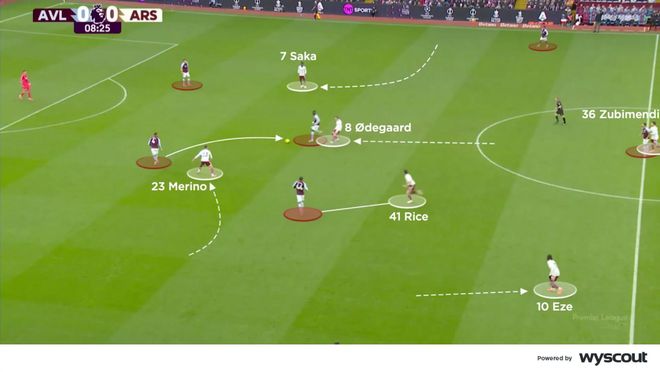 另一边,阿森纳上半场建立进攻时,进行了大量进攻位置轮换,边后卫卡拉菲奥里与本·怀特常成为中路的最靠前的进攻点,直接对位维拉的中卫。梅里诺回撤支援中场,让厄德高与赖斯有更多自由活动与回撤空间,尤其是当苏比门迪落位防线,让两名中卫拉开宽度以通过三后卫站位建立进攻时(下图)。边锋萨卡与埃泽都会拉开宽度,但阿森纳上半场的进攻还是主要通过右路组合(萨卡与怀特)来给维拉制造麻烦。
