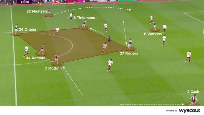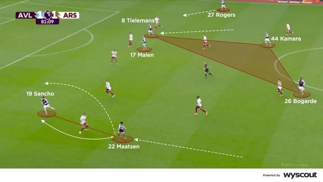埃梅里应对之策是用马伦换下沃特金斯,用桑乔换下麦金,并将罗杰斯调整到右路。这令维拉进攻线更宽,加上后防线向前的有目标性的直塞,让维拉在比赛末段掌握了更多主动权。主队的边后卫从低位加入协助进攻,制造了多次传中与其他机会;蒂勒曼斯配合马伦冲击禁区,双后腰则在他们身后提供支援(下图)。