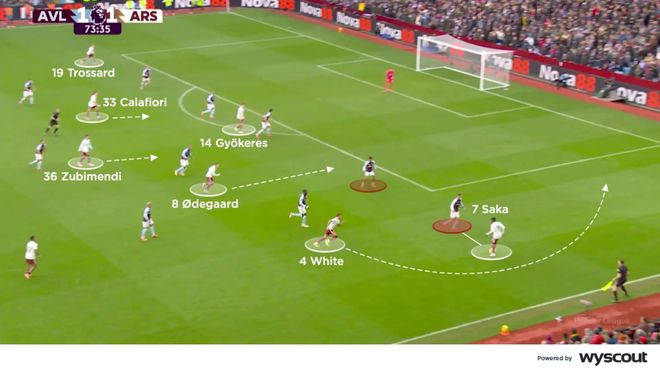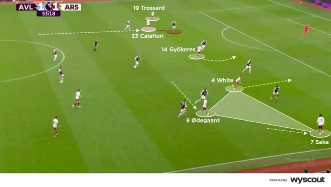 下半场,双方都做出有影响力的换人调整:阿森纳在半场换上特罗萨德与哲凯赖什,替下埃泽与梅里诺。这让球队的进攻轮换减少了,但右路配合依旧顺畅。厄德高向右移以进一步支援,萨卡与怀特为插上的队友制造冲击禁区的机会。哲凯赖什在维拉两名中卫之间做出聪明跑动,卡拉菲奥里仍从左边卫的位置前插肋部,这一系列跑位牵制了维拉的右后卫,并让特罗萨德在后点获得空间(下图)。