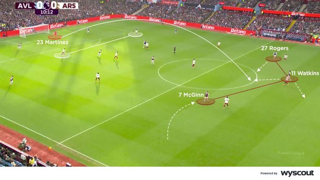 对此,维拉开始通过长传穿越逼抢,后防线球员——尤其是门将马丁内斯——更多选择长传。罗杰斯与麦金原本是中场边路球员,但此时也靠内站位,以争夺这些长传的落点。沃特金斯也回撤参与第一点争顶,同时在身后伺机争夺漏下的二点球(下图)。萨卡与梅里诺仍然保持高位压迫,阿森纳应该并不介意在后防线上留下一组3v3防守,因为本·怀特也会从防线前压以支援萨卡的高位逼抢。