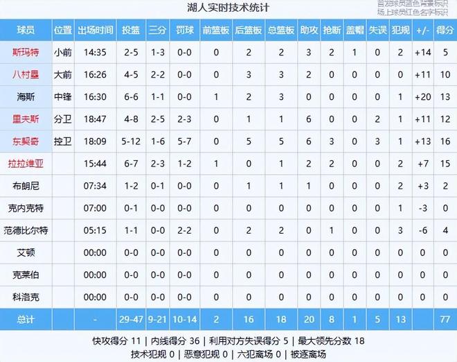湖人数据(主队):东契奇16分5板6助3断、拉拉维亚15分1板2助2断、海斯13分3板、里夫斯12分1板6助、八村塁10分3板2助、斯玛特5分2板3助2断、范德比尔特4分2板、布朗尼2分1板1助